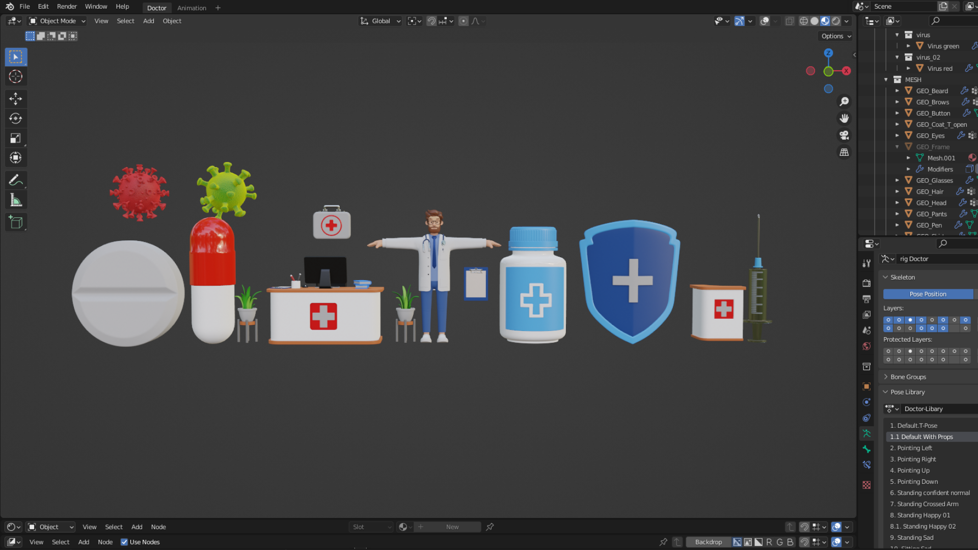 - 10+ Medicine work related assets. (Desk setup, Pills, Virus, Medicine Box, Notepad, Pill container, Medicine Shield, Syring)
