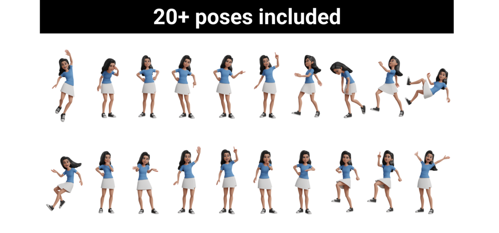 A fully-rigged, low-poly 3D character with clean topology, advanced face/body rig, 20 premade poses, PBR materials and production-ready lighting—delivered in .blend (Cycles/Eevee), GLB, FBX & OBJ.